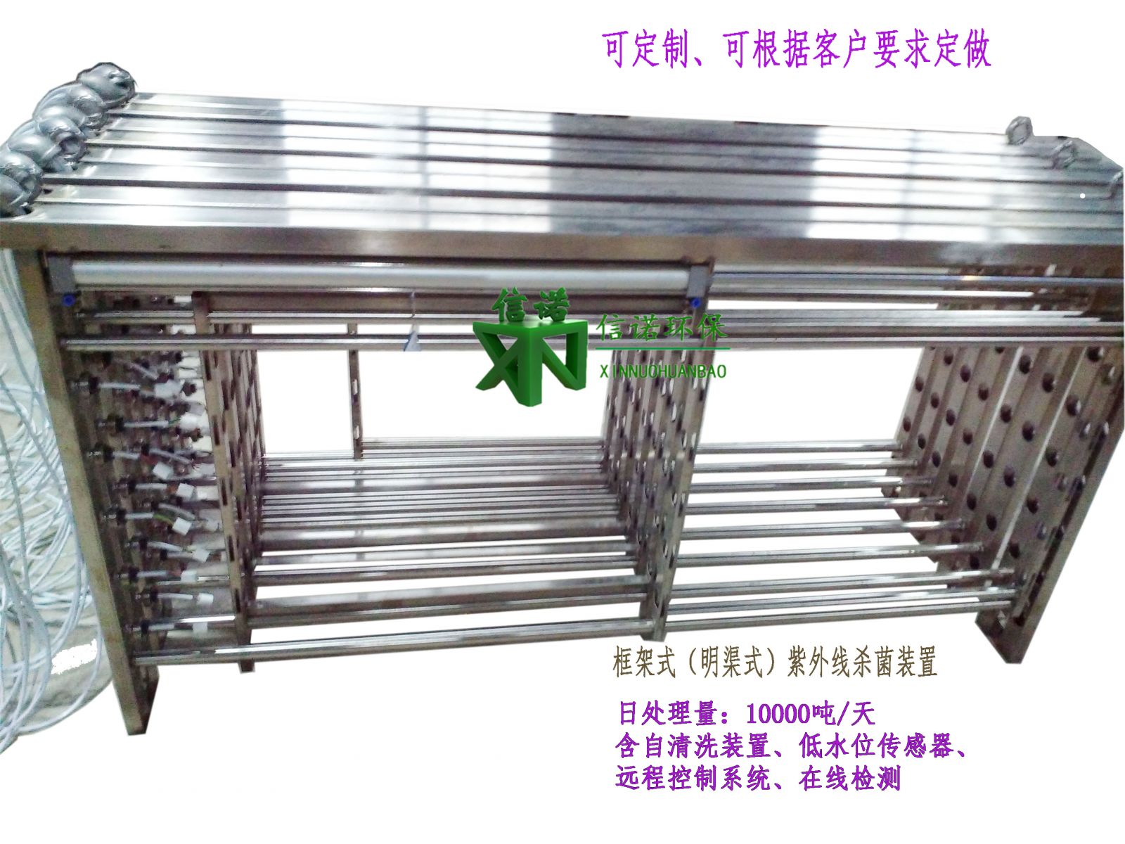 二、產(chǎn)品介紹框架式(明渠式)紫外線消毒器是通過(guò)布置于開槽溝渠 內(nèi)的紫外消毒模塊上的紫外燈發(fā)出中心輻射波長(zhǎng)為253.7nm的短波紫外線對(duì)流經(jīng)溝渠的水體進(jìn)行殺菌消毒,從而解決處理后的污水細(xì)菌指標(biāo)的超標(biāo)問(wèn)題,使**終排放水體的細(xì)菌學(xué)標(biāo)達(dá)到并超過(guò)國(guó)家相關(guān)排放標(biāo)準(zhǔn)及水質(zhì)標(biāo)準(zhǔn)要求。